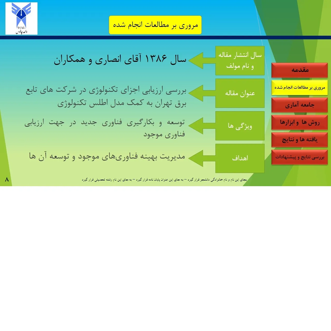 هاین یک نمونه از پاورپوینت های طراحی شده توسط اینجانب می باشد که بصورت حرفه ای و برای جلسه دفاع ارشد تهیه شده، که قابلیت لینک گذاری صفحات نیز در آن قرار داده شده است.